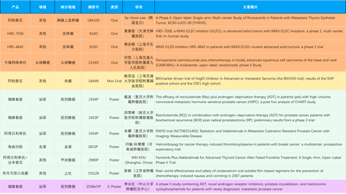 在胸腺上皮肿瘤、头颈鳞癌、肉瘤、前列腺癌、甲状腺癌等其他多个疾病领域,卡瑞利珠单抗、阿帕替尼、瑞维鲁胺、阿得贝利单抗、法米替尼、HRS-7058、HRS-4642等抗肿瘤创新药相关研究一共入选了4项口头报告、1项简短口头报告、4项壁报、1项电子壁报,彰显了AG视讯医药强大的研发实力。此外,海曲泊帕和昂丹司琼口溶膜分别在防治化疗导致的血小板减少和恶心呕吐方面各有1项研究入选壁报。